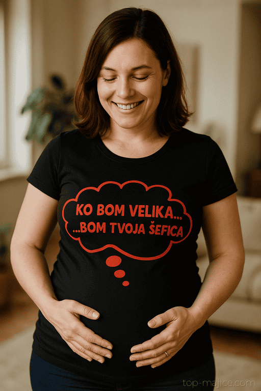 Oblaček misli na trebuščku pove čisto vse: mala šefica je na poti, vi pa nosite najboljši punchline v mestu. Ta majica je magnet za nasmehe v pisarni, na kavi ali na nujnem “sestanku” s tortico. Popolna, ko želi bodoča mami pokazati, kdo bo v hiši vodil dnevni red.