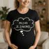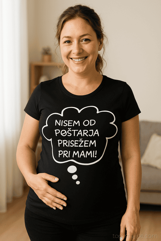 Ko stopiš v sobo, ta majica poskrbi za smeh še preden karkoli poveš. Črn kroj + bel govorilni oblaček = zmagovalna kombinacija za vse, ki nosečnost nosimo z nasmehom. Popolna za trenutke, ko želiš razbiti led in pustiti, da govorijo napisi – ne vprašanja.