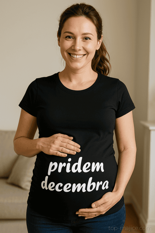 Črna nosečniška majica z belim tiskom pove vsem, kdaj pričakovati največji praznični paket. Popolna za sprehode pod prazničnimi lučkami, družinska srečanja in fotke ob smrečici – ker je pridem decembra boljša napoved od vremenske! 😉