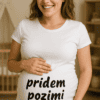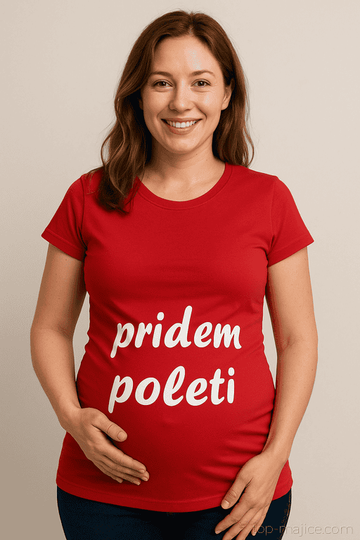 Rdeča nosečniška majica, ki spremeni vsak sprehod v poletno napoved: malček prihaja kmalu. Kratek in sladek napis pove vse brez dolgih razlag in prinese kup nasmehov. Odličen način za simpatično razkritje termina in lovljenje srčnih reakcij.