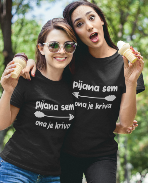 Ko se noč prevesi v “še eno rundo”, ta komplet poskrbi, da vsi vedo, kdo je (uradno) kriv. Črne kratke majice z belim potiskom in puščicama sta popoln tandem za fotke, ples in nepozabne inside joke trenutke. Oblecita jih in si zagotovita smeh, kjerkoli se pojavita.
