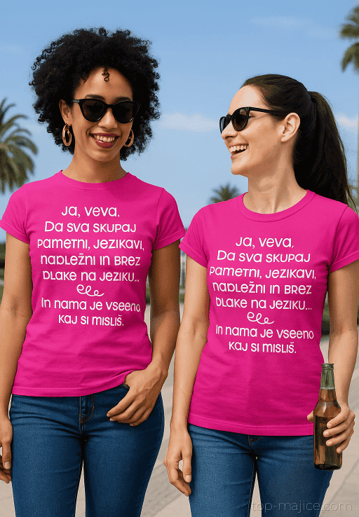 Rožnati duo za neustavljivo dvojico brez filtra! 💕 Na njima piše: ‘Ja, veva, Da sva skupaj Pametni, Jezikavi, Nadležni in brez Dlake na jeziku… in nama je vseeno kaj si misliš.’ Popolno za pare, BFF ali sestre z ostrim jezikom. 😎