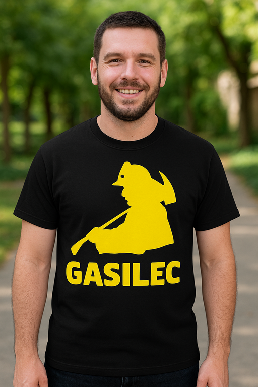 Velik rumen obris gasilca s sekiro na črni podlagi jasno pokaže, kdo je šef akcije. Slogan GASILEC je glasen kot sirena, ti pa pobiraš spoštljive poglede in dodatne high-five. Idealno za intervencije, dežurstva ali sproščen off-duty, ko želiš nositi pogum na prsih (dobesedno).