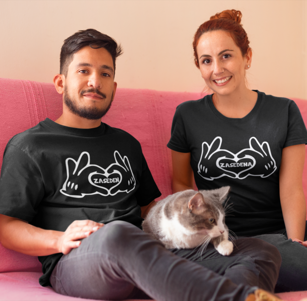 Srce na majici? Seveda! 💘 Komplet z ljubkim motivom rok, ki narišejo srce, in jasnim statusom: ZASEDENA. Za pare s smislom za humor in ljubezen! 😄