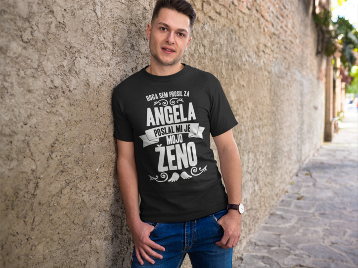 😇 Ljubezen od zgoraj, smeh od spodaj! Majica s sloganom ‘BOGA SEM PROSIL ZA ANGELA POSLAL MI JE MOJO ŽENO’ je instant kompliment in šala v enem.