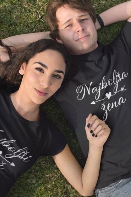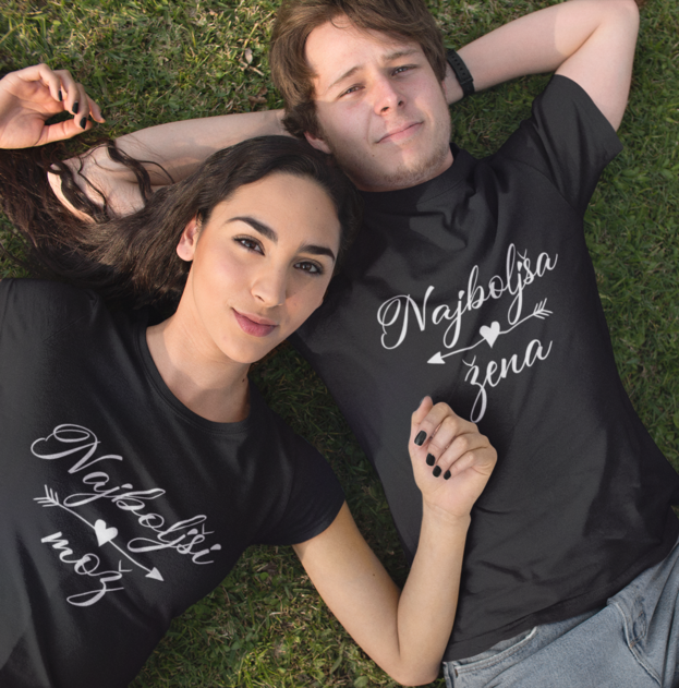 Ko sta oba najboljša, je edina dilema, kdo prvi pobere komplimente. Dve črni kratki majici z belim tiskom ter motivi srčka in puščice povesta naglas, kar vajino srce že ve. Idealno za skupne fotke, kave v mestu in trenutke, ko želite uskladiti videz in humor.