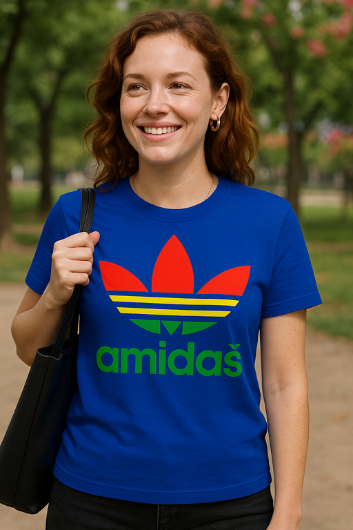 Ko nekdo reče “adidas”, ti pa: amidaš! 😄 Modra majica z barvito grafiko poskrbi za takojšen smeh. Top za šaljivce, zabave in sproščena darila! 🎁