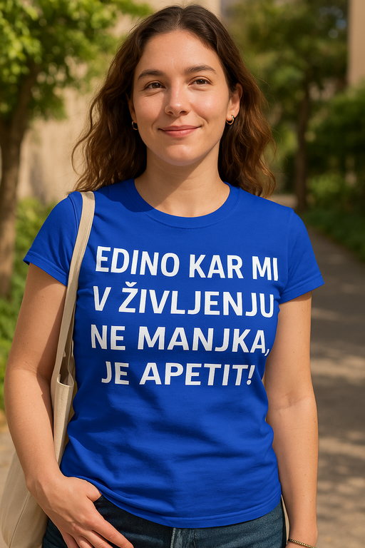 Modra majica s kratkimi rokavi in belim napisom je idealna izjava za vse, ki jedilnik preberejo prej kot vremensko napoved. Nosi se kot znak prepoznavanja med gurmani in kot opozorilo prijateljem: prinesi prigrizke ali se umakni od hladilnika. Naj se ve, da tvoj apetit nikoli ne vzame dopusta!