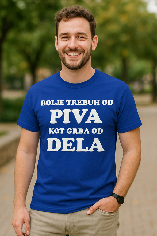 🍺😂 Modra majica + bel napis = popoln alibi: BOLJE TREBUH OD PIVA KOT GRBA OD DELA!