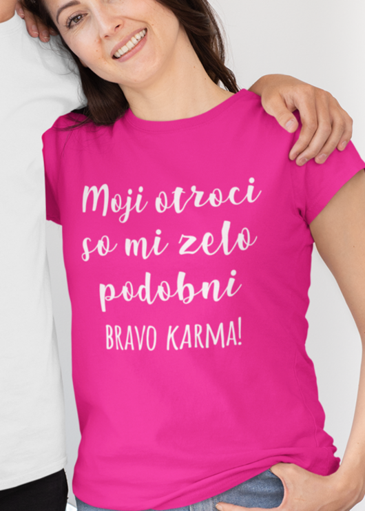 Živo rožnata ženska majica s kratkimi rokavi in belim potiskom na sprednji strani je tvoj uradni mikrofon za mamine punchline. Od igrišča do pisarne in naprej – poskrbi, da bo jasno, po kom so mali geni podedovali svoj šarm (in trmo!).