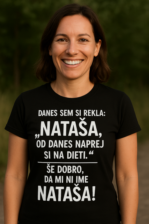 Ko te dieta pokliče, se ne oglasiš – razen če ti je ime Nataša. 😜 Ta črna ženska majica s hudomušnim potiskom bo nasmejala vsako družbo in rešila marsikateri kos torte. 🎉 Perfektna za prijateljice z apetitom in smislom za humor!