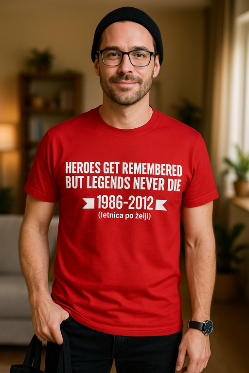 Legende ne umrejo – samo zamenjajo majico! 😎 Rdeča kratka s sloganom HEROES GET REMEMBERED BUT LEGENDS NEVER DIE 1986-2012 (letnica po želji) naredi vsak outfit epski. Idealna za rojstne dni, obletnice in vse, ki živijo po legendarnih pravilih. 🦸‍♂️