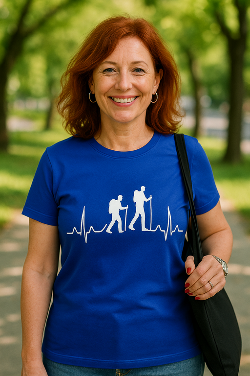 Naša modra majica z belim motivom dveh pohodnikov na srčnem utripu je vizitka za vse, ki hodijo za razgledom in ostanejo za smeh. Dovolj kul za kočo, dovolj zabavna za mesto – in popoln način, da pokažeš, kaj ti zares požene kri po žilah.