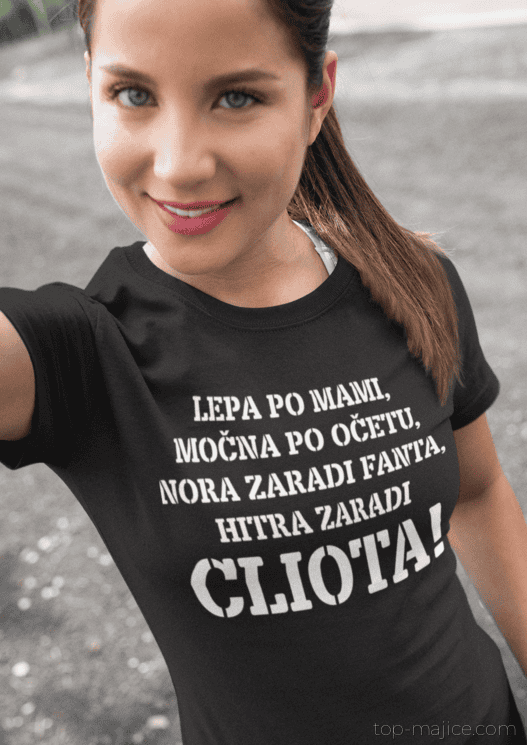 Ta črna, oprijeta kratka majica je za punce, ki se znajo pošaliti na svoj račun in imajo rade malo adrenalina. Slogan pove vse – genetski bonus, nor fant in Clio, ki vedno ve, kje je desni pas. Od vsakdana do večerne kave: oblečeš, nasmejiš in odbrziš.