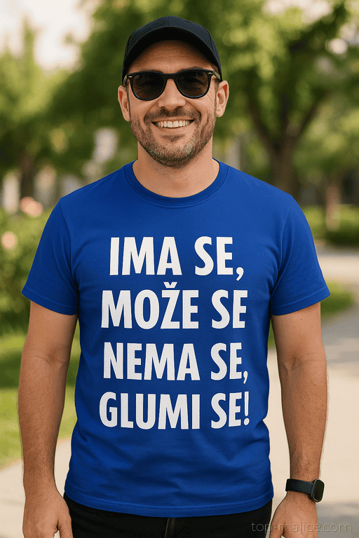 Modra majica, ki se zna pošaliti namesto tebe! 😎 Napis ‘IMA SE, MOŽE SE NEMA SE, GLUMI SE!’ je popoln za prijatelje, sodelavce in vse mojstre improvizacije. 🎉