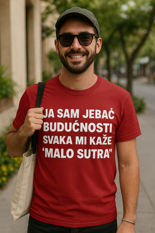 Rdeča kratka majica, ki pove vse brez filtra. 😎 Napis JA SAM JEBAČ BUDUĆNOSTI SVAKA MI KAŽE ‘MALO SUTRA’ sproži salve smeha. Popolna za frajerje, žurerje in kralje sarkazma. 😂