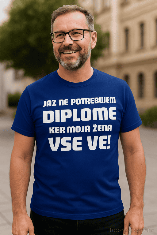 🤣 Konec debat – ta modra majica s kratkimi rokavi jasno pove: JAZ NE POTREBUJEM DIPLOME KER MOJA ŽENA VSE VE!