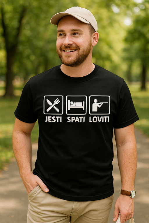 Za jutranje preže, večerne zaslede in vmesne sendviče – ta majica je uradna uniforma tvojega lovskega urnika. Minimalističen črn dizajn z belim tiskom jasno sporoča: danes se lovi (če ne divjati, pa poglede). Kadar zmanjka besed, naj govori napis.