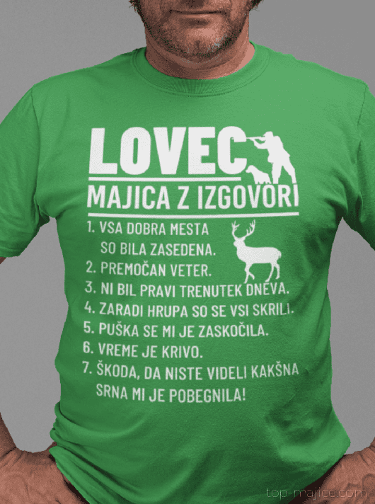 Zelena kratka majica z lovsko silhueto in belim tiskom je narejena za prave lovske legende (in njihove legendarne razlage). Ko te vprašajo, kako je šlo, samo pokaži na prsi in uživaj v smehu. Idealna za kočo, poligon ali nedeljsko kosilo pri tašči.