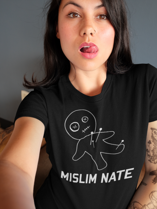 Ko besede ne pomagajo, spregovori vudu lutka! 🪡 Ta črna majica z belo grafiko in napisom MISLIM NATE pove vse namesto tebe. Idealna za pare, prijatelje in vse z duhovitim smislom za humor. 😄
