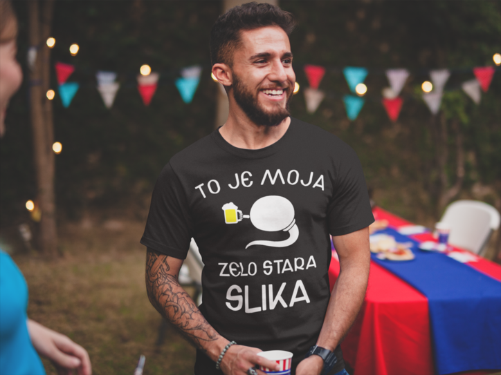 Ko se na eni fotki znajdeta pivo in dudica, nastane legenda! 🍺🍼 Črna majica s sloganom “TO JE MOJA ZELO STARA SLIKA” je za pivoljube in novopečene starše (ter tiste, ki nikoli ne odrastejo). 😄