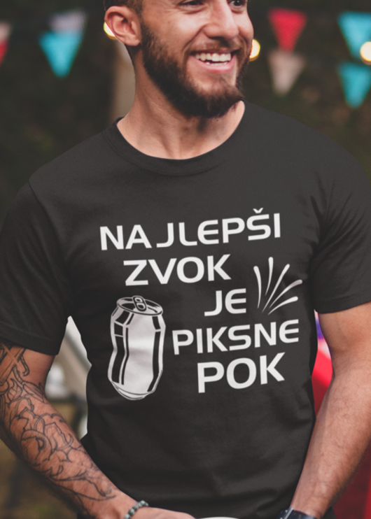 POK, pa veselje naokrog! 🍻 Črna majica z napisom NAJLEPŠI ZVOK JE PIKSNE POK.