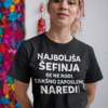 Petek je tiho trkal, zdaj ga lahko oblečeš! 😎 Črna majica z drznim belim napisom “PETEK JE MOJA DRUGA NAJLJUBŠA BESEDA NA P” pove to, kar si vsi mislimo. Idealna za pisarniške junake, petkofile in prijatelje, ki živijo za vikend. 🎉