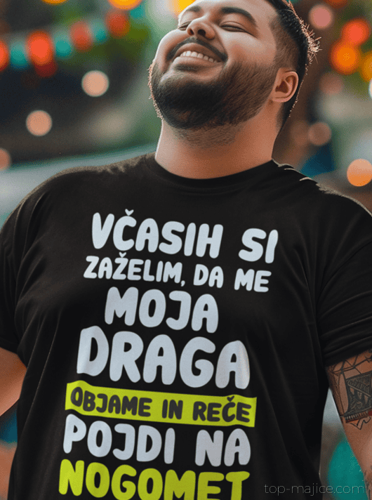 ⚽️ Ko romantičen objem sreča navijaški krik – rezultat je ta majica s sporočilom: VČASIH SI ZAŽELIM, DA ME MOJA DRAGA OBJAME IN REČE POJDI NA NOGOMET.