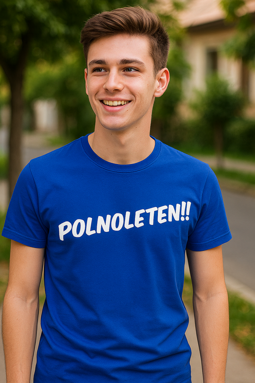 🎉 Modra majica, bel napis in jasno sporočilo: POLNOLETEN!!