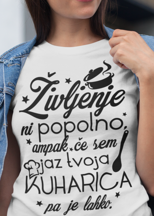 🍳 Recept za srečo: bela majica + smeh + “Življenje ni popolno, ampak če sem jaz tvoja KUHARICA pa je lahko.”