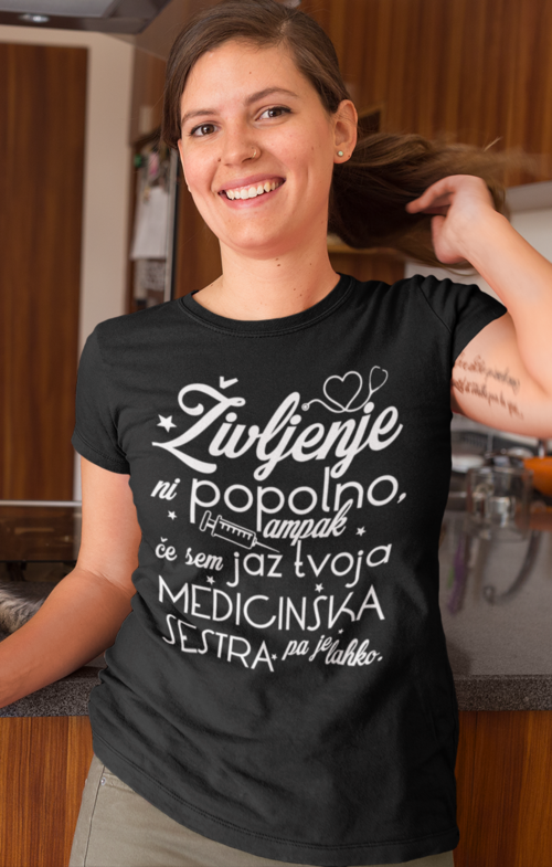 Črna ženska majica s kratkimi rokavi in belim tiskom poskrbi, da sporočilo zasije v ambulanti, bolnišnici ali na zasluženi kavici po dežurstvu. Slogan “Življenje ni popolno, ampak če sem jaz tvoja MEDICINSKA SESTRA, pa je lahko.” pove vse: malo šale, veliko resnice in en velik poklon sestram, ki držijo svet skupaj.