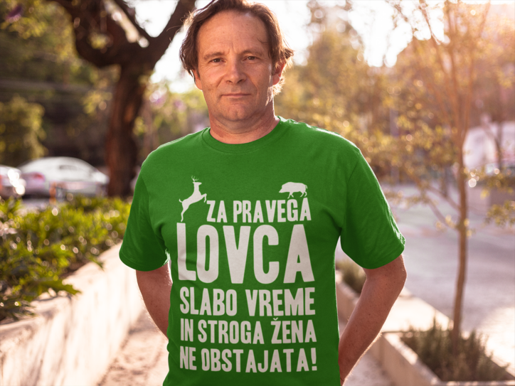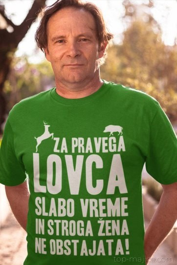 Živo zelena barva, drzen bel napis in silhueti jelena ter divjega prašiča povesta, kdo je gospodar gozda (in zakonskih pogajanj). Nosljiva šala za vse, ki dež vidijo kot gratis tuš, blato pa kot spa tretma. Opozorilo: povzroča nasmehe in zavist v lovski družini. 😄