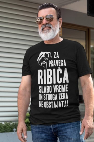 🎣 Ko vreme nagaja in doma komandira admiralka, ta majica pove resnico: “ZA PRAVEGA RIBIČA SLABO VREME IN STROGA ŽENA NE OBSTAJATA!”