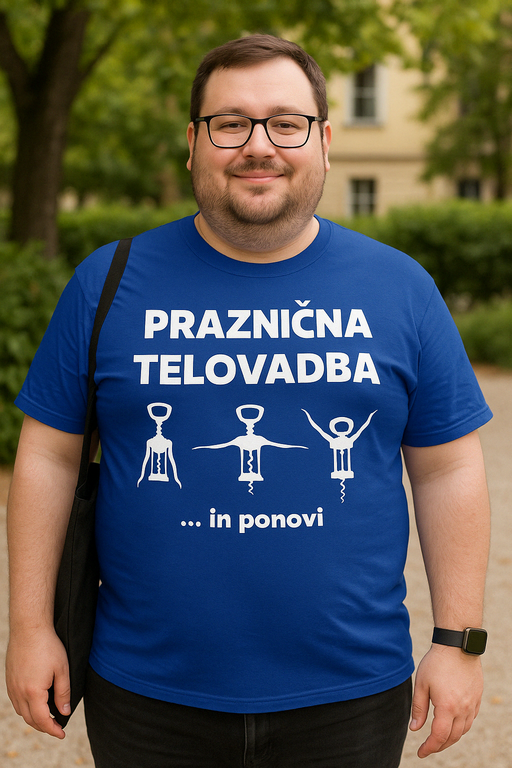 Modra kratka majica z ilustracijami vinskega odpirača v vseh pozah je popoln izgovor, da dvigneš kozarec – večkrat. Slogan zadene bistvo prazničnega maratona: odpremo, polijemo, nazdravimo… in ponovimo, seveda.