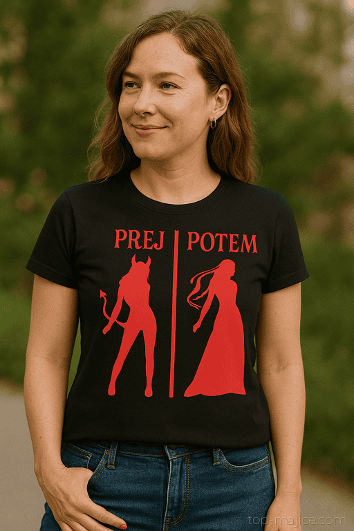 Ko besede odpovejo, ta majica nastopi s silhuetami in jasno razlago: najprej malo poredno, potem zelo urejeno. Popolna za zabave, fotke in trenutke, ko želiš svetu pokazati svoj “switch” iz PREJ v POTEM. Smeh zagotovljen, komplimenti prav tako.