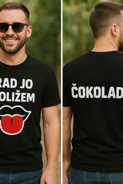 😜🍫 Spredaj “RAD JO POLIŽEM”, zadaj “ČOKOLADO” — majica, ki pušča ljudi v smehu, ne v dvomih.