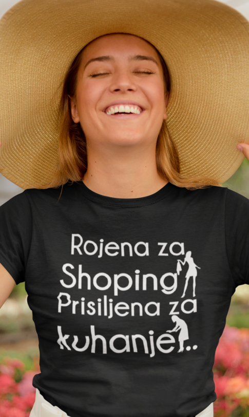 🛍️➡️🍳 Najprej shopping, potem prisila! Majica z napisom ‘Rojena za Shoping Prisiljena za kuhanje!..’ pove resnico na glas.