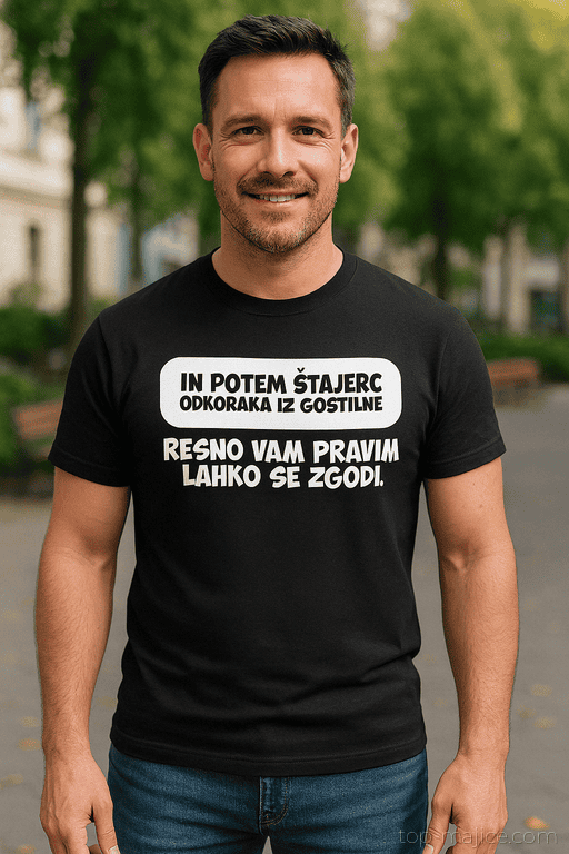🍺 Ko Štajerc reče, da bo odkorakal iz gostilne, nastane legenda. Slogan ‘IN POTEM ŠTAJERC ODKORAKA IZ GOSTILNE RESNO VAM PRAVIM LAHKO SE ZGODI.’ na tej majici pove vse.