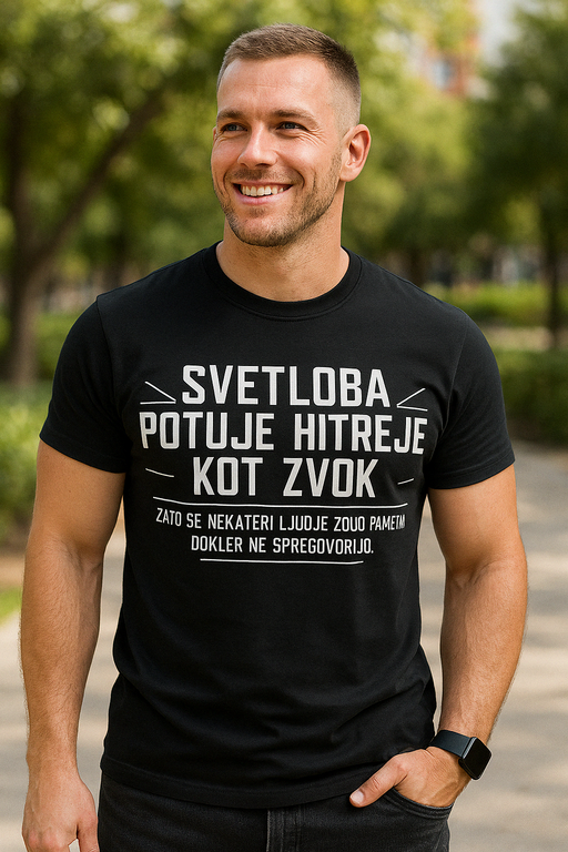 Spredaj nosi nepozaben napis: SVETLOBA POTUJE HITREJE KOT ZVOK ZATO SE NEKATERI LJUDJE ZDJO PAMETNI DOKLER NE SPREGOVORIJO. Črna majica s kratkimi rokavi in belim tiskom izgleda samozavestno, duhovito in vedno zadene v tarčo. Idealna za predavanja, pisarno ali večerne debate, ko želiš povedati veliko – brez besed.