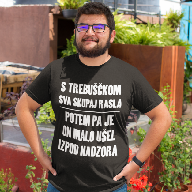 🤣 Črna majica + bel napis ‘S TREBUŠČKOM SVA SKUPAJ RASLA POTEM PA JE ON MALO UŠEL IZPOD NADZORA’ = instant smeh!