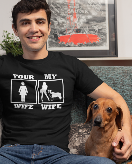 🐾😂 YOUR WIFE MY WIFE na črni majici – instant smeh za vse ljubitelje psov!