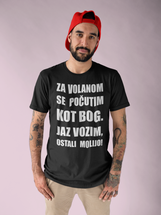 😅 Plin do tal, ego do neba – in majica to pove namesto tebe: ZA VOLANOM SE POČUTIM KOT BOG. JAZ VOZIM, OSTALI MOLIJO!