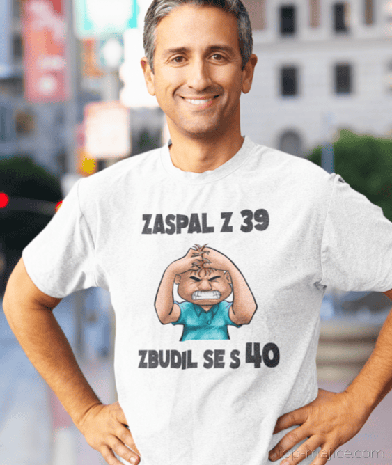 Ta bela kratka majica z jeznim risanim junakom, ki si drži glavo, je čista resnica o velikem prehodu. Slogan ZASPAL Z 39 ZBUDIL SE S 40 je popoln za vse, ki 40-ko raje pospremijo z dobrim smehom kot s solzami. Naj se ve, da je bil to samo še en naporen spanec – in še bolj zabujeno jutro.