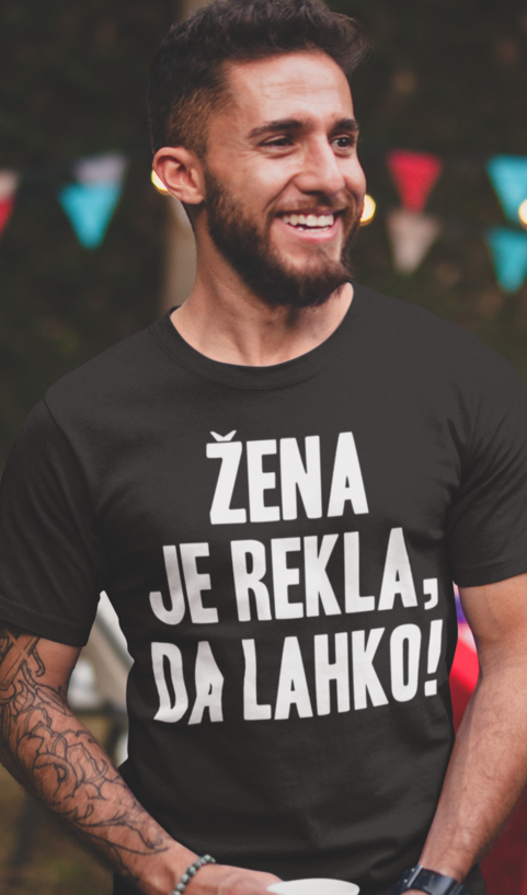 Ko te vprašajo, če ti je žena dovolila – samo pokaži na majico! 😄 Krepki napis ŽENA JE REKLA, DA LAHKO! pove vse brez pogajanj. Super za partnerje, prijatelje in vse s smislom za humor. 🎁