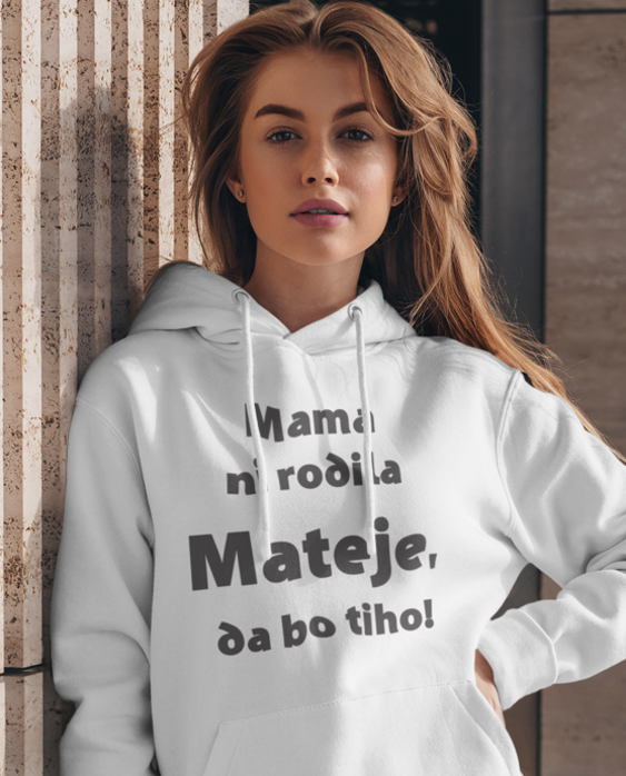🗣️ Tišina je precenjena! ‘Mama ni rodila Mateje, da bo tiho!’ na puloverju s kapuco pove resnico na glas.