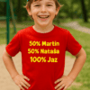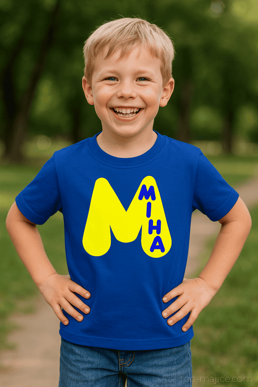 Na modri majici s kratkimi rokavi zasije velika rumena črka M, v njeni desni nogi pa navpično piše MIHA v modri barvi. Rezultat? Majica, ki že na daleč pove, kdo je šef igrišča in zbiralec vseh petk! Popolno za male Mihe, ki želijo svoj prihod oznaniti stilno in glasno (brez kričanja).