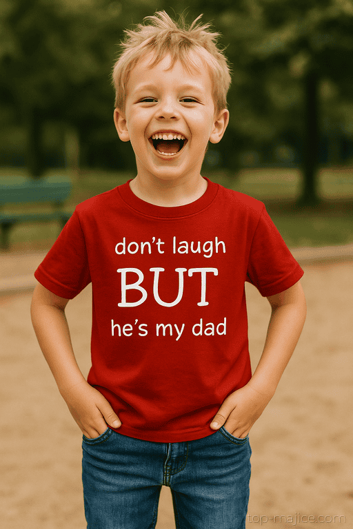 Ta rdeča otroška majica s kratkimi rokavi in belim potiskom je popoln odgovor na očkove legendarne fore. Naj mali ponosno pokaže, kdo je njegov superheroj, in obenem poskrbi za takojšen smeh na igrišču, v vrtcu ali na družinskem kosilu. Kratko, jasno in neustavljivo simpatično.