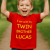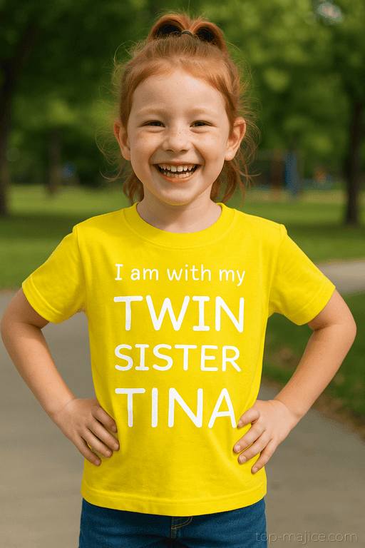 Ko sta dvojčici v akciji, je red nujen – in ta majica je vaša megafon tabla. Svetla rumena barva in jasen bel napis povesta vse, še preden kdorkoli sploh vpraša. Manj zmede, več “ooo” in “aaa” ter foto dokazov za domači album.