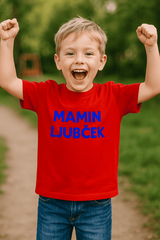 Ta rdeča otroška majica s kratkimi rokavi in modrim napisom MAMIN LJUBČEK je kot majhen megafon mamine ljubezni – samo veliko bolj ljubek. Ko mali junak prikoraka v prostor, je jasno, kdo je številka ena (namig: najboljši objemi in palačinke). Popolna za vrtec, obiske pri babici in vse trenutke, ko je treba očku malo hudomušno pomežikniti.