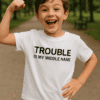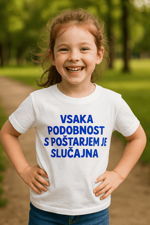 Bela kratka majica z glasnim sporočilom ‘VSAKA PODOBNOST S POŠTARJEM JE SLUČAJNA’ poskrbi za smeh na igrišču, v parku in pri babici. Popolna za fotke, še boljša za vsakdan – in dovolj nedolžna, da se vsi samo nasmehnejo. Naj mali trendsetter dostavi dobro voljo, kamor koli pride!